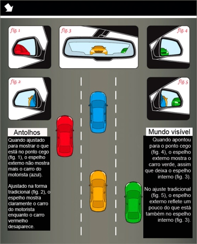 Isto pode ser desorientador para os motoristas acostumados a ver as laterais do seu próprio carro nos espelhos. Mas, quando posicionados corretamente, eles evitam os pontos cegos de um carro. Isso elimina a necessidade de olhar para trás para mudar de faixa com segurança, bem como a necessidade de um caro sistema de alerta de ponto cego. O único problema é se acostumar com as posições recomendadas. O retrovisor da cabine é utilizado para sabermos o que está vindo atrás, enquanto os espelhos externos refletem a área fora da visão do retrovisor interno.