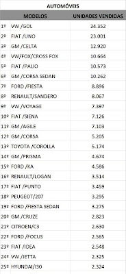Entre os modelos, o Gol segue na frente de Uno, o Palio se recupera (com a chegada do Novo) e fica em quinto, mas o Fox avança para quarto lugar, embora apenas poucas unidades à frente do Palio e Classic. March, Jetta e Cruze deram um salto nas vendas.