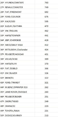 Liderança das montadoras, a Fiat leva o primeiro lugar nos dois segmentos, seguida da mesma forma pelaVW, GM e Ford. Quanto aos autos a Renault aparece em quinto, seguida de Nissan, Peugeot, Hyundai, Citroën e Toyota. Destque para o March que elevou a posição da Nissan no ranking dos automóveis.